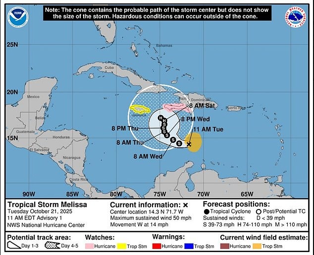 The NHC released the first official cone for Melissa, showing what meteorologist Gerald Mengel called ‘a nightmare’