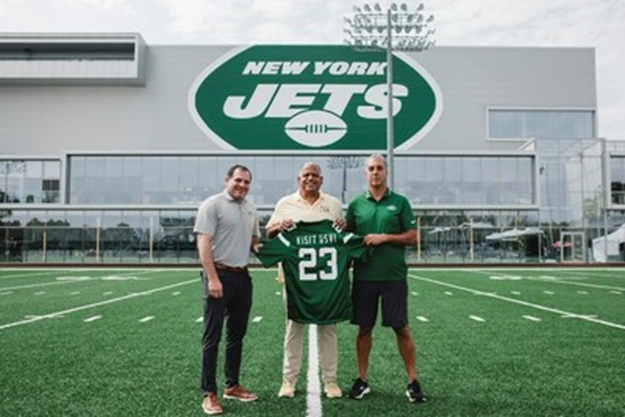 The New York Jets and USVI celebrated the partnership launch in late July with a meeting at the franchise’s Florham Park headquarters, where Commissioner Boschulte met with team leadership and former players during pre-season practice.