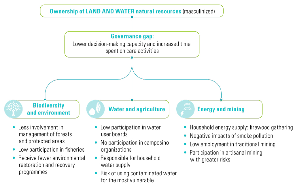 “There is a complex and multidimensional relationship between gender equity and natural resource policies. That relationship involves care work, which falls disproportionately on women; the productive sphere, where there are significant inequalities in access to and control and management of natural resources; and the existence of differentiated vulnerabilities to the effects of climate change and the environmental impacts of human activity.”