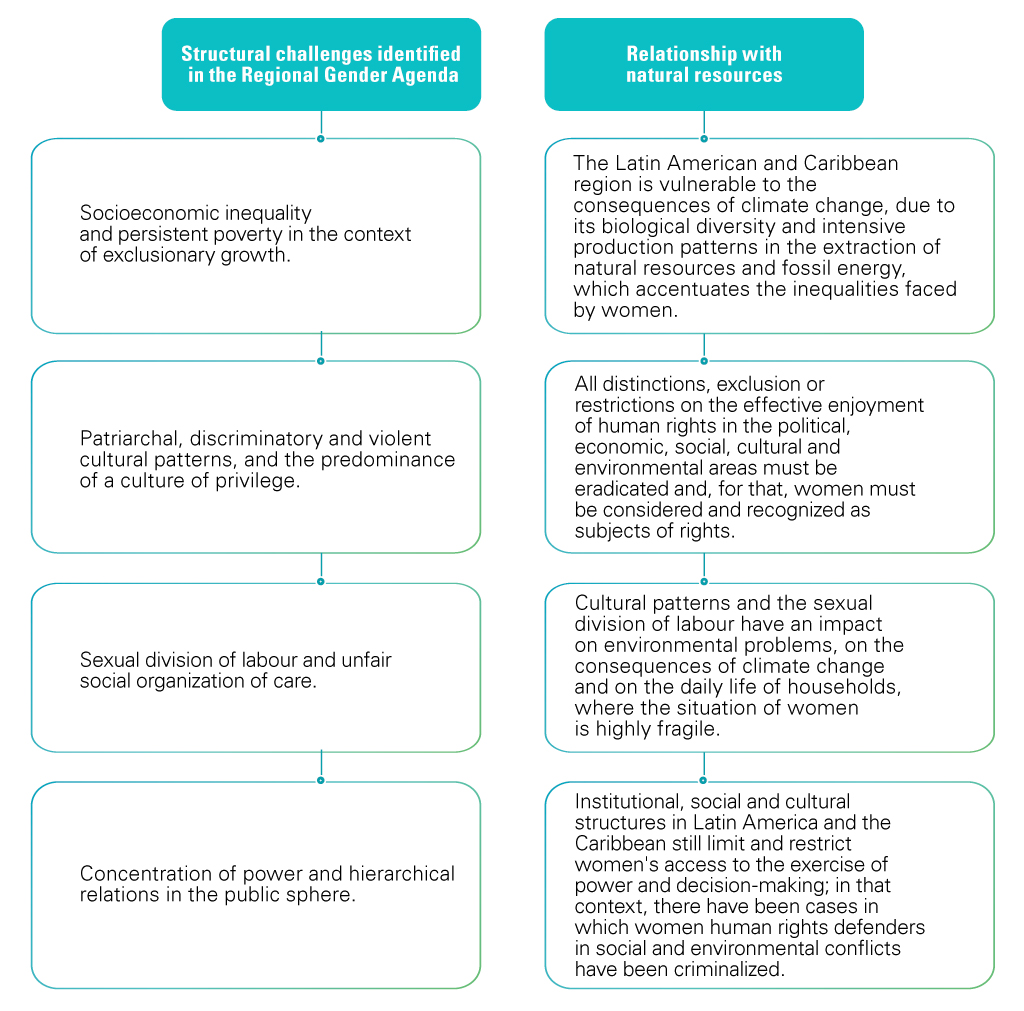 “This tool identifies four structural challenges that must be resolved to attain the SDGs in consideration of the region’s context and its gender priorities and challenges. As regards natural resources, each of those challenges presents major problems on account of the dependence of the region’s productive structure on natural resources and its vulnerability to climate change. It also identifies patriarchal cultural patterns that need to be eradicated before women can effectively enjoy their rights in various areas, including the environmental sphere (see diagram 2).”