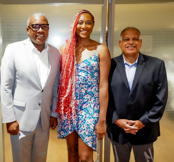 US Virgin Islands Governor Albert Bryan Jr. and Tourism Commissioner Joseph Boschulte celebrate with St. Thomas native and WNBA All-Star Aliyah Boston.